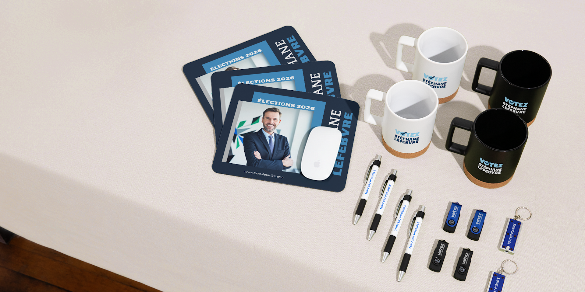 Parmi les cadeaux publicitaires populaires, on trouve les stickers, les badges, les stylos, les sacs en toile et les gourdes. Choisissez des articles que vos partisans utiliseront réellement et qui assureront la visibilité de votre campagne au quotidien. Tenez compte de votre budget et de la facilité avec laquelle ces articles peuvent être distribués lors d’évènements ou en porte-à-porte.