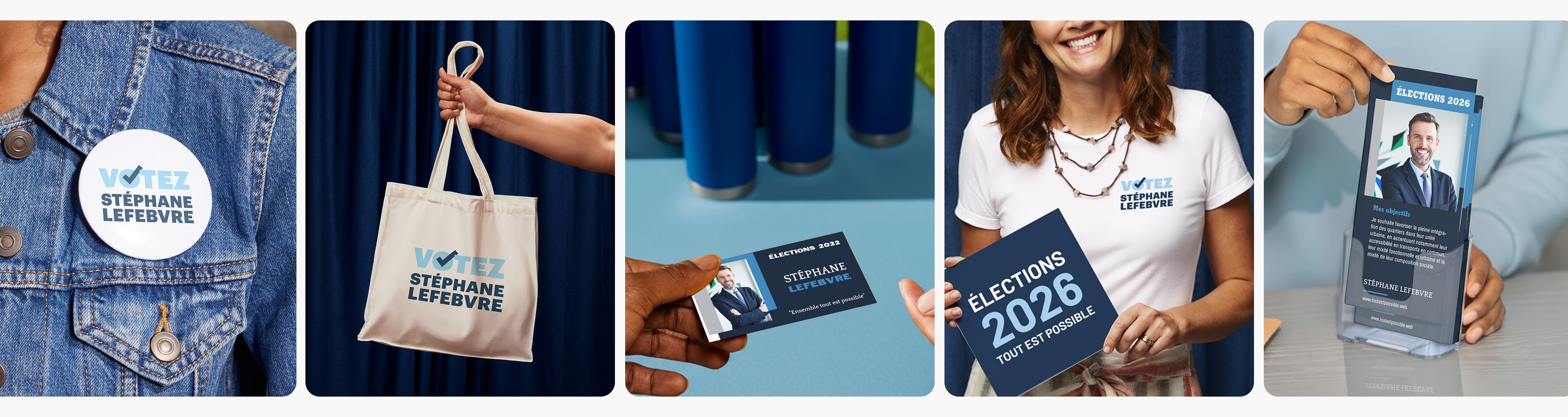 Commencez par les essentiels : des cartes de visite pour le réseautage personnel, des flyers et des cartes postales pour sensibiliser les électeurs et des produits d’affichage comme des banderoles et des affiches pour une grande visibilité lors d’évènements ou dans les espaces publics. À mesure que votre campagne prend de l’ampleur, ajoutez des articles publicitaires comme des stickers, des badges et des sacs en toile pour développer le soutien de la communauté.