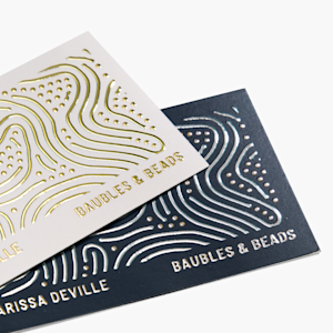 Plus vous attirez l’attention sur les informations clés, comme le nom ou le logo de votre entreprise, plus vous avez de chances qu’on s’en souvienne. Nos cartes de visite effet métallisé en relief mettent en avant vos coordonnées, réseaux sociaux, offres spéciales, dates importantes et plus encore. Pour éviter le mélange ou les bavures entre les lettres, il est préférable de ne pas utiliser l’effet métallisé en relief sur les polices très fines ou les petits détails, ainsi que sur les bordures à double trait. Pour un résultat optimal, utilisez une taille de police d'au moins 12 pt et évitez d’appliquer l’effet métallisé près des bords. Vérifiez que tous les éléments avec effet métallisé en relief se trouvent bien à l'intérieur des marges de sécurité pour l’impression et le découpage de vos cartes.