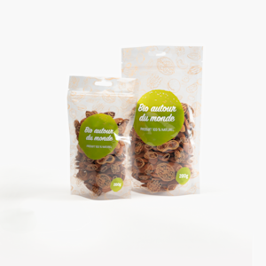 Nous proposons des sachets doypack fabriqués à partir de plastique durable facilement recyclable. Ce matériau offre une excellente protection contre l’oxygène et l’humidité. Faites votre choix parmi des finitions mate, glacée ou soft touch et optez pour celle qui convient le mieux à vos produits. Nos sachets sont toujours dotés d’une encoche d’ouverture pour les ouvrir facilement. Vous pouvez également ajouter des détails supplémentaires, comme des zips refermables pour une utilisation à multiples reprises ou des trous de suspension pour les présenter en magasin.Commencez la personnalisation ou optez pour des échantillons