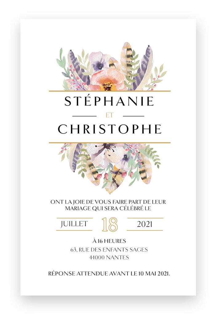 Artiste dans l’âme, vous avez envie de tout faire vous-même ? Optez pour un faire-part au style rustique et ajoutez une touche personnelle avec des stickers personnalisés pour lui donner un côté fait maison. Vous pouvez également choisir un motif végétal ou fleuri, que vous pouvez personnaliser avec des fleurs séchées pour un rendu simple et intimiste.