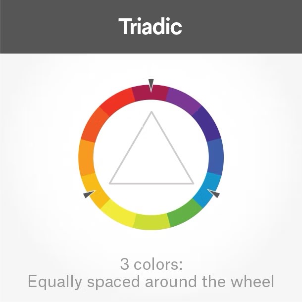 - Triadique : une sélection de trois couleurs qui sont opposées les unes aux autres sur la base d’un triangle équilatéral