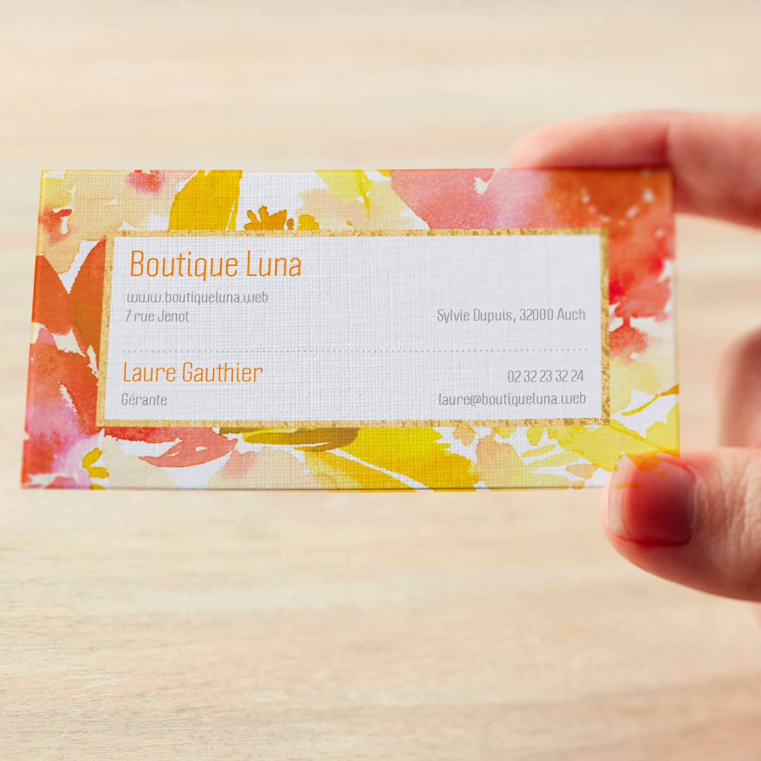 - Cartes de correspondance : créez des cartes de remerciement que vous glisserez dans chaque commande. Ajoutez un effet métallisé en relief pour ajouter une petit touche en plus.