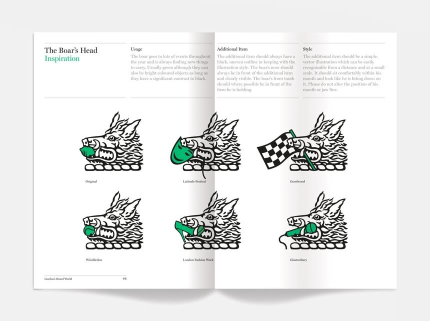 Pour accompagner la lecture, on peut également placer stratégiquement certains éléments sur une double page. Les guides de marque suivants ont mis des images et du texte entre les pages de leur guide, fluidifiant ainsi la lecture.
