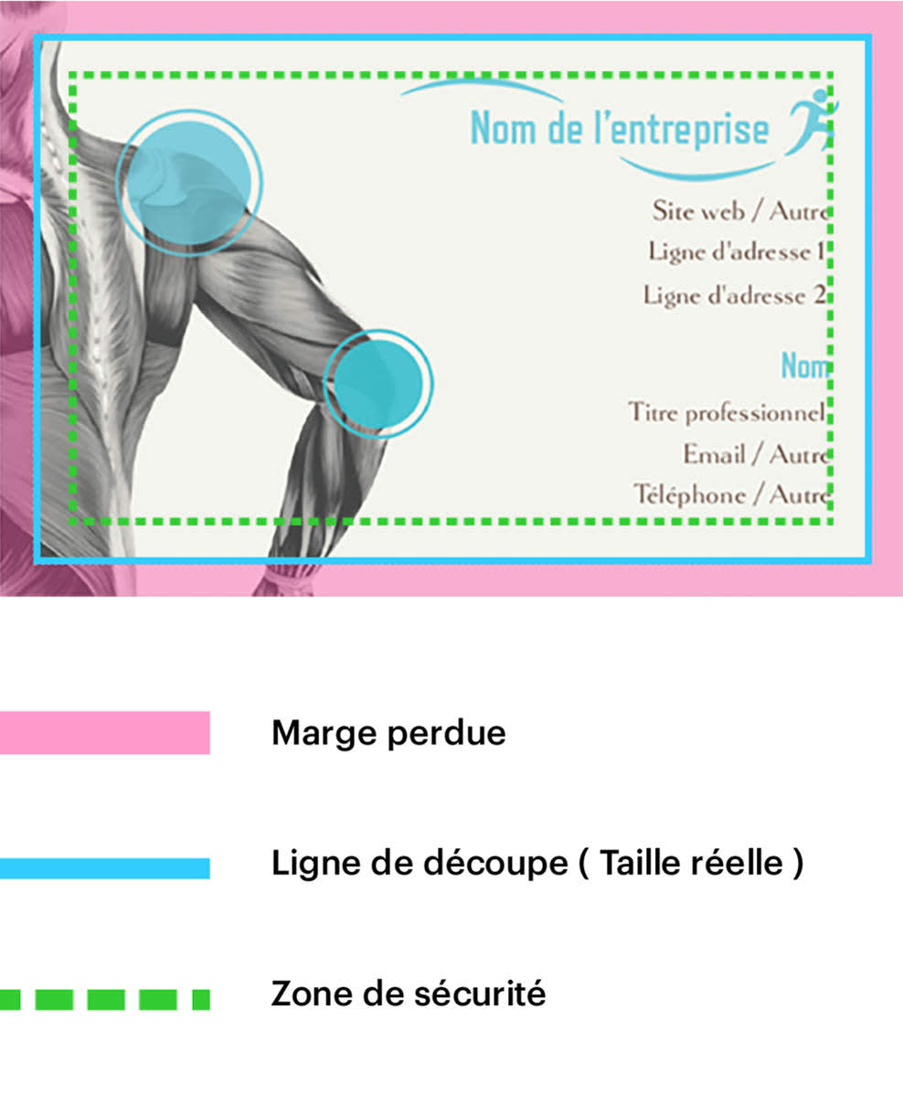 - Que vous respectez une marge de sécurité dans votre design : cela évitera que votre texte et/ou vos éléments visuels soient tronqués à l’impression. Voici quelques lignes directrices pour vous aider à créer la carte de visite parfaite :