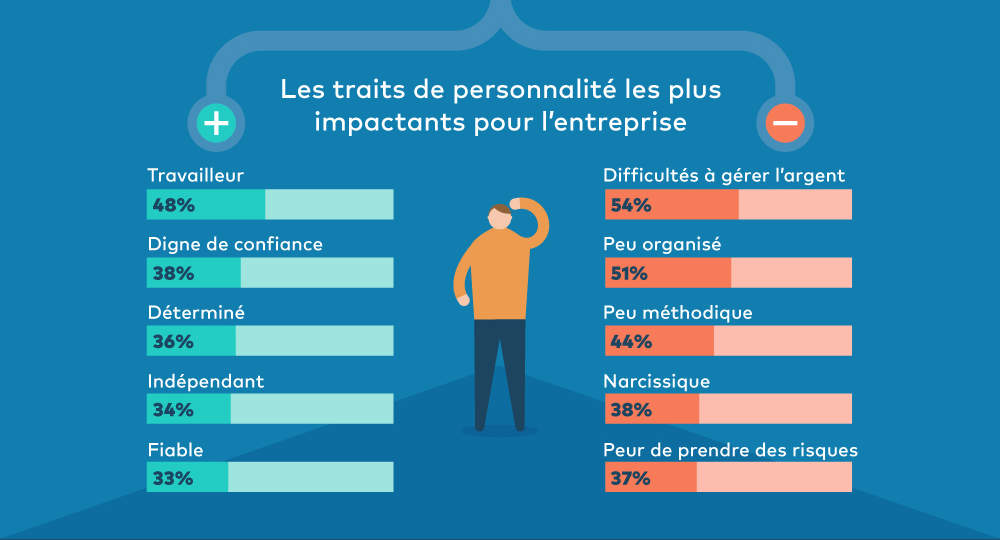 Pour la vaste majorité des chefs d’entreprise, se lancer à son compte « n’est pas fait pour tout le monde ». En fait, ils sont même 84 % à penser que devenir entrepreneur requiert d’être doté d’un certain type de personnalité. Il semblerait d’ailleurs que certains traits de caractère prédisposent davantage à l’entrepreneuriat… et au succès ! Ainsi, notre étude révèle que plus de la moitié des entrepreneurs sont des personnes indépendantes, travaillant dur et dignes de confiance, et que ces mêmes traits soient par ailleurs perçus comme les qualités les plus susceptibles d’assurer la réussite d’une entreprise.