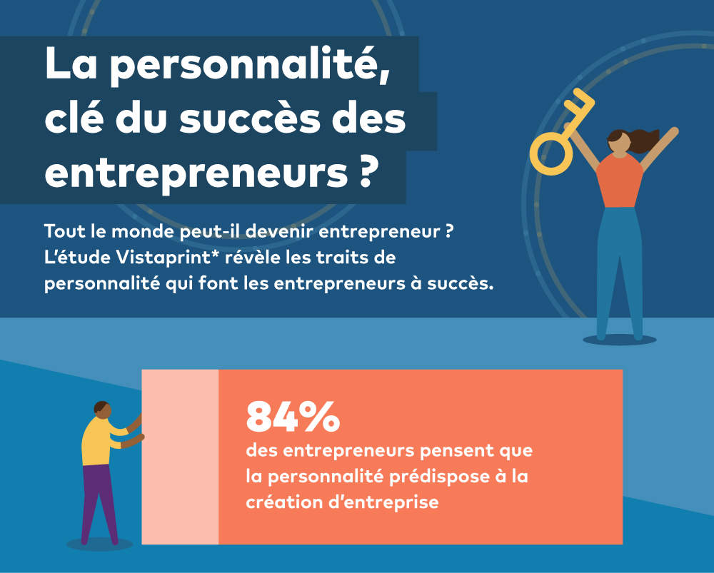 Les entrepreneurs qui réussissent partagent-ils des traits de personnalité ? Existe-t-il un profil type d’entrepreneur ? Vistaprint a étudié la personnalité de 500 entrepreneurs français pour tenter de répondre à cette question. Découvrez les résultats de l’étude dans l’infographie suivante :