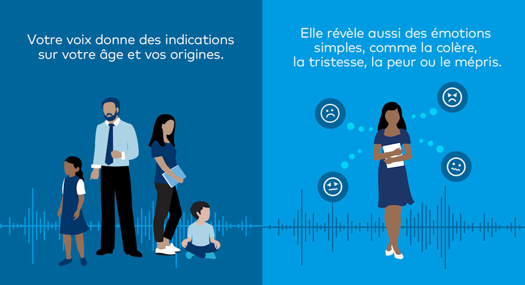 Votre voix est aussi unique que votre empreinte digitale. Elle vous différencie des autres et permet aux gens qui vous connaissent de vous reconnaître. Les sons que vous prononcez quand vous parlez donnent des indices sur votre âge, votre sexe et vos origines. Votre voix transmet également des indications sur vos émotions et quand vous devez réfléchir à quelque chose.