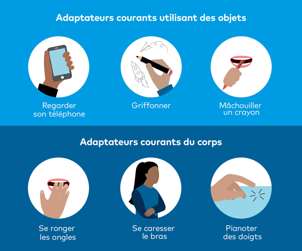 Les adaptateurs sont des comportements comme se toucher les cheveux ou jouer avec un stylo. Ce sont des réponses naturelles aux réactions négatives qu’on peut avoir par rapport à soi ou aux autres.