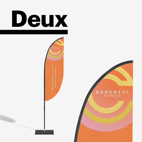 Créez des drapeaux publicitaires attrayants pour capter l’attention des passants et aider vos clients à vous trouver : vous pouvez les guider en disposant plusieurs drapeaux jusqu’au lieu de votre cours, puis en placer un autre pour indiquer votre point de rassemblement. Les drapeaux publicitaires sont le support idéal pour promouvoir votre marque où que vous alliez, car il vous suffit de les installer là où vous animez vos cours et de les déplacer si besoin.