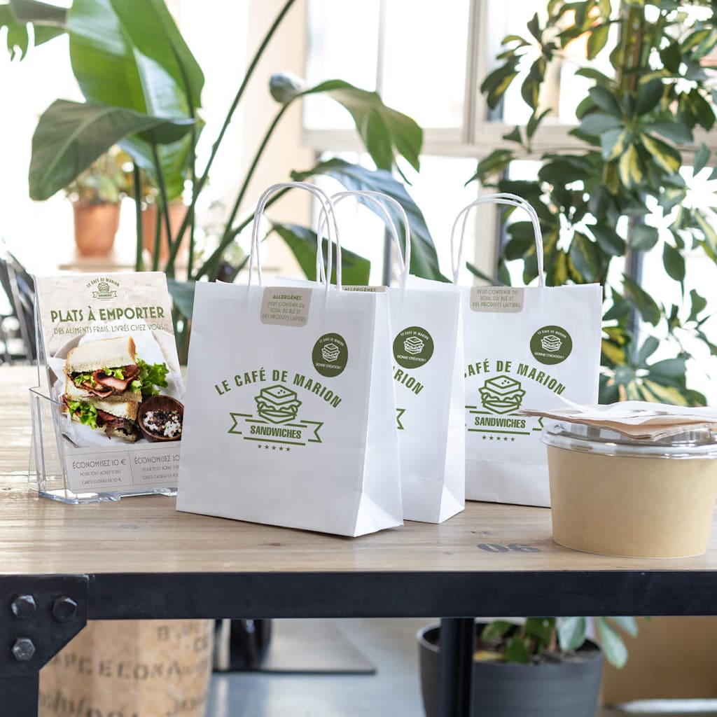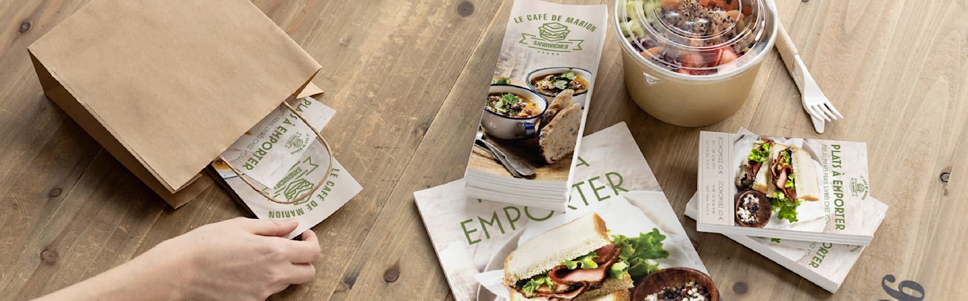 N’oubliez pas d’ajouter un support de communication adapté, comme un flyer, une carte postale ou un menu dans chaque sac pour annoncer des offres ou des promotions à venir, partager des informations sur la livraison ou même quelques détails sur l’histoire de votre entreprise.