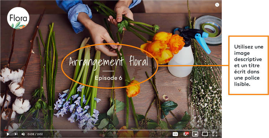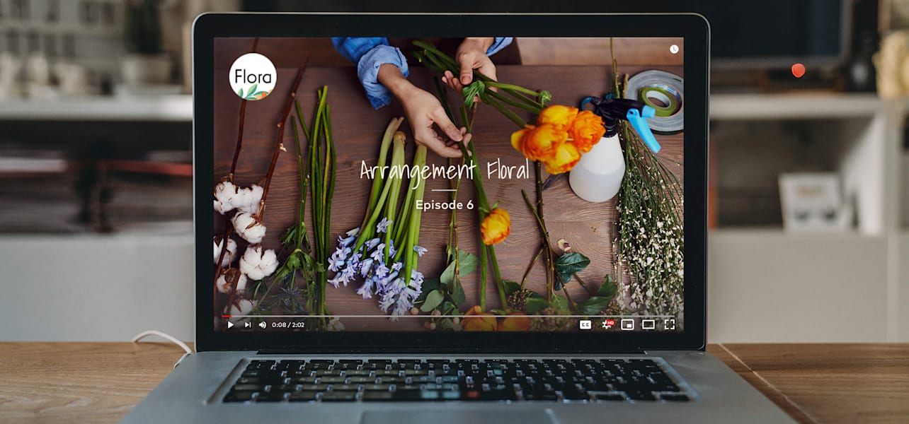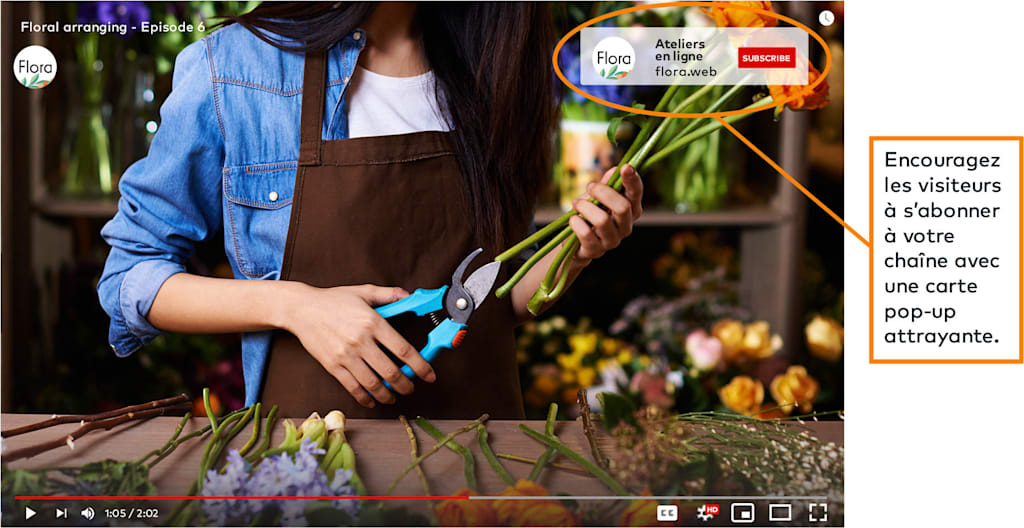 Si vous créez une suite de tutoriels pour promouvoir votre boutique de fleurs, choisissez le titre de chaque vidéo comme s’il s’agissait d’un épisode d’une série, par exemple : Création de bouquets avec Flora, épisode 6. Profitez-en pour ajouter une fiche à la fin de votre vidéo, qui redirigera vos spectateurs vers les autres épisodes de votre série !