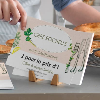 De nombreux produits comme les cartes postales, cartes de visite, stickers et flyers permettent l’ajout d’un code QR grâce à une zone dédiée sur nos modèles : vous pourrez télécharger facilement votre code pour l’insérer sur nos produits.