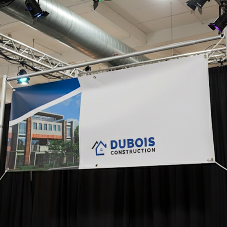 Pour les évènements en extérieur, optez pour les banderoles standard de 310 g/m² ou les bâches microperforées composées de polyester tissé qui laisse passer l’air. Tous nos matériaux d’extérieur résistent à la décoloration, à la pluie et aux vents modérés.