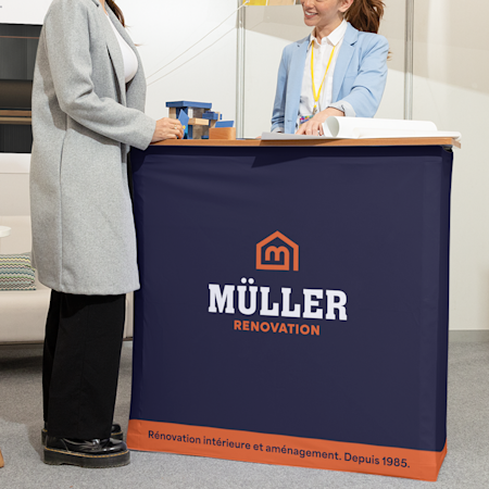 - Installation rapide avec des banderoles rétractables, des nappes de table et des produits d’affichage