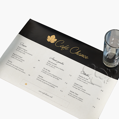 Les menus sont conçus en polypropylène brillant, mat, recyclé ou résistant à l’eau. Les sets de table sont disponibles en papier affiche, en laminage soft touch ou en plastique imperméable durable.