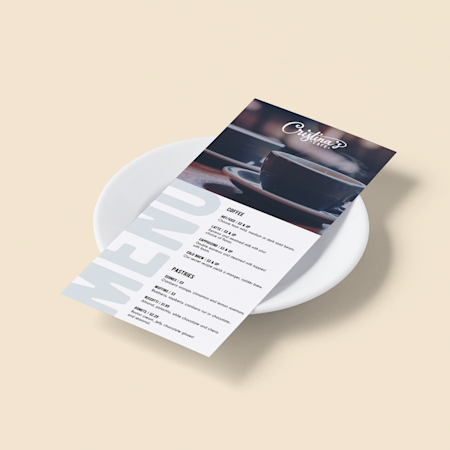 Les menus non pliés sont des feuilles de 210 x 95 mm personnalisables au recto et au verso. Ils sont idéals pour des menus plus courts ou pour les menus du jour. De dimensions 93 x 216 mm une fois pliés, les menus à trois volets présentent six parties séparées avec de l’espace pour les informations de votre restaurant, des photos et plus encore.