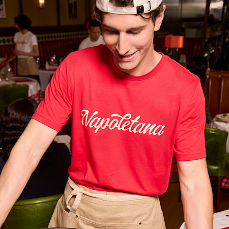 Employé d’une pizzeria portant un t-shirt personnalisé en train de servir des clients.